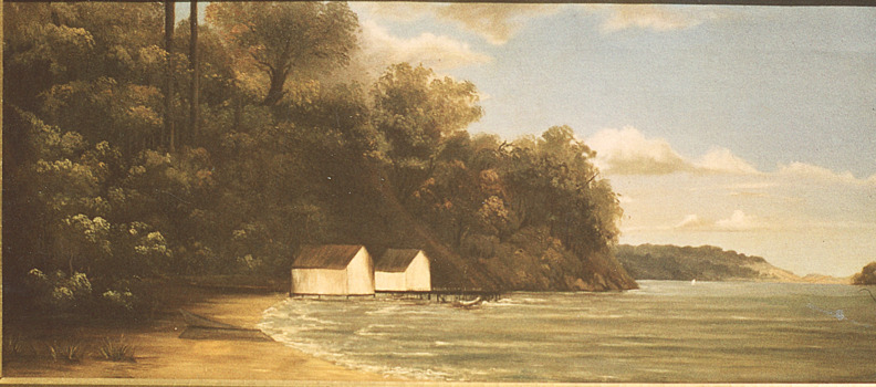 Coloured photo of a painting of the cliffs near Nyerimilang Victoria. Plus a second photo showing the boat sheds on Nyerimilang Jetty