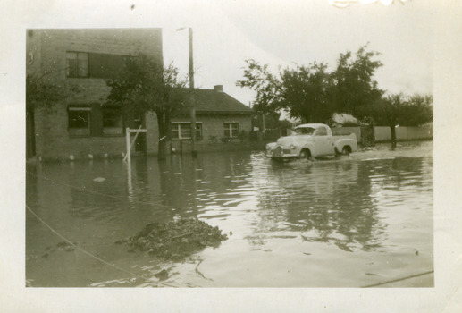 A small snapshot of the 1956 flood,taken ar Armstrong St cornr. The CBC bank is on th left of the photo. A utility truck is driving through the water. Photo taken by A Howell in May 1956