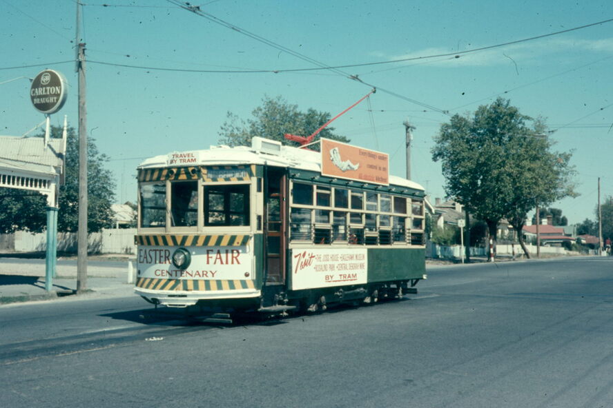 1 - tram 28 at Golden Square - tram has a headboard advertising the Easter Fair and other locations that could be visited by tram