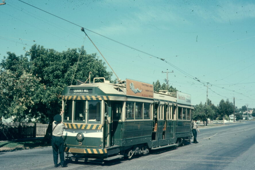 1 - tram 5 at Quarry Hill with the conductor raising the trolley pole.