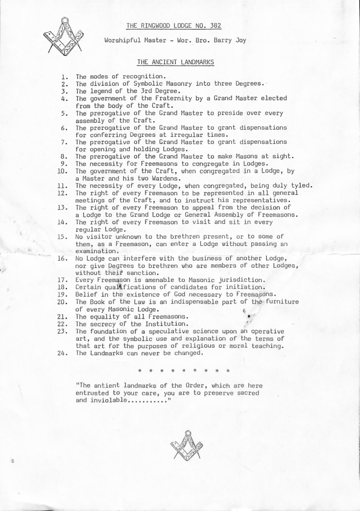 A4 single page Document setting out "The Ancient Landmarks of the order" (24 items) for Ringwood Lodge No 382, Worshipful Master - Wor. Bro. Barry Joy