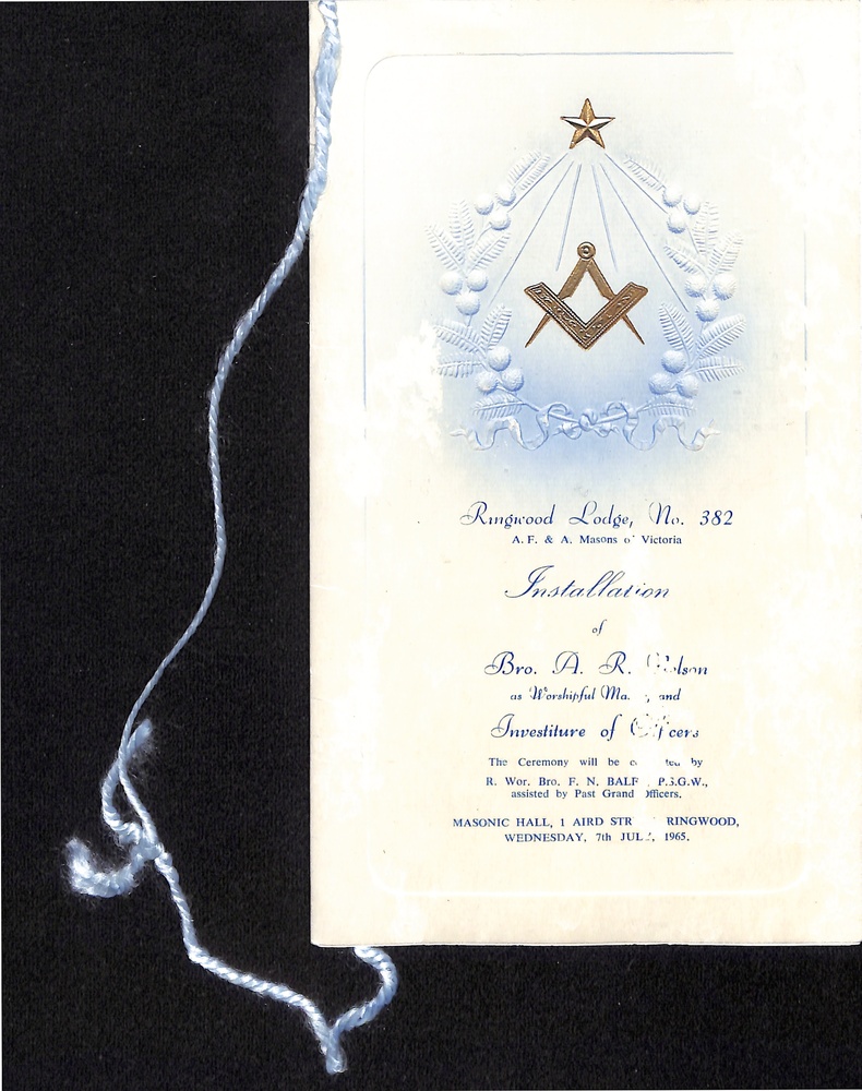 Coloured prorgram on buff card for the Installation of Bro. A.R. Nelson as Worshipful Master and Investiture of Officers, at Masonic Hall, 1 Aird St, Ringwood on Wednesday 7th July 1965