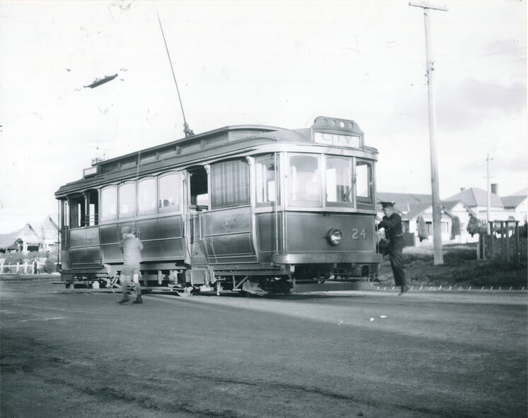 Black and white print of SECV Geelong 24 at Eastern Park with a school boy in shorts and wearing a cap turning the trolley pole, while the motorman/conductor boards the tram for its return trip to the City. There is a Pay as you enter sign by the front door. The tram was withdrawn from service on 25/10/1951. Photo c1950, photographer unknown.