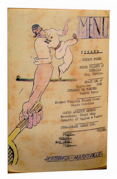 A colour photograph of a hand drawn menu from Kooringa Guest House in Marysville. This menu is dated 18th May 1936. There were hundreds of menus created by Wilbur Anderson and some were related to special days (ie St. Patrick's Day, the Melbourne Cup, etc.) with the dishes reflecting this. Unfortunately, the entire collection of original menus was lost in the 2009 Black Saturday bushfires.