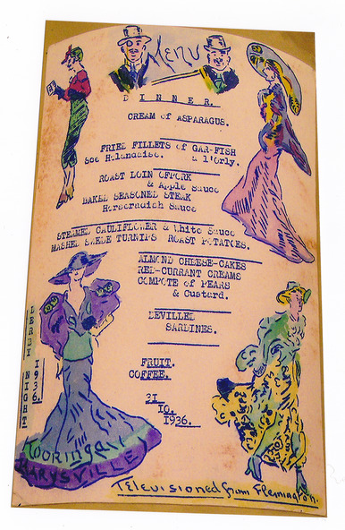 A colour photograph of a hand drawn menu from Kooringa Guest House in Marysville. This menu is dated 31st October 1936. There were hundreds of menus created by Wilbur Anderson and some were related to special days (ie St. Patrick's Day, the Melbourne Cup, etc.) with the dishes reflecting this. Unfortunately, the entire collection of original menus was lost in the 2009 Black Saturday bushfires.