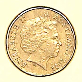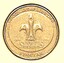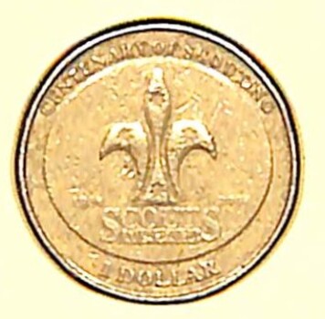 Australian One Dollar Coin. The obverse side features the portrait of Queen Elizabeth II. The reverse side features the international symbol for scouting, the fleur-de-lis representing the compass which symbolizes the three promises made by all scouts and cubs throughout the world.