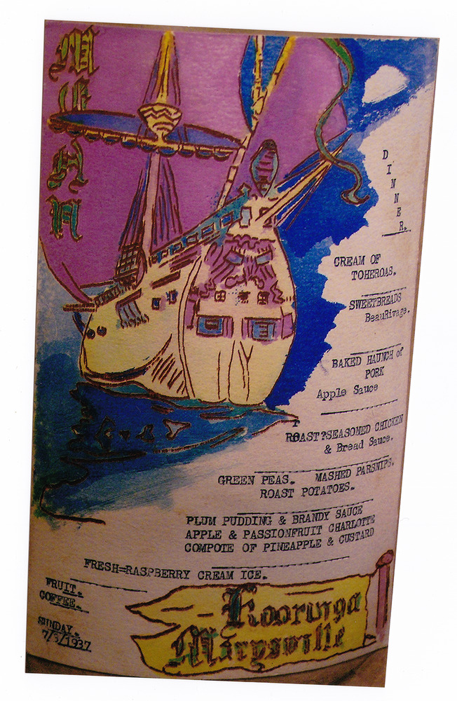 A colour photograph of a hand drawn menu from Kooringa Guest House in Marysville. This menu is dated 7th March 1937.