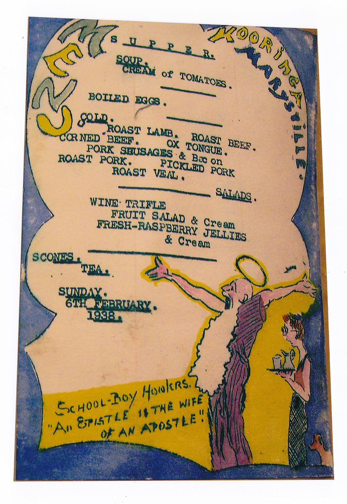A colour photograph of a hand drawn menu from Kooringa Guest House in Marysville. This menu is dated 6th February 1938. There were hundreds of menus created by Wilbur Anderson and some were related to special days (ie St. Patrick's Day, the Melbourne Cup, etc.) with the dishes reflecting this. Unfortunately, the entire collection of original menus was lost in the 2009 Black Saturday bushfires.