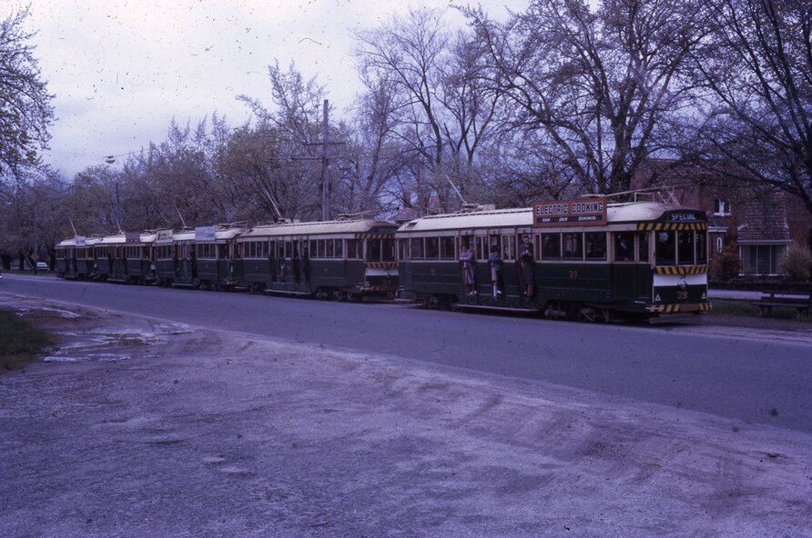 1 - the long line up of trams in Sturt St West - 5 bogie trams lead by No. 39