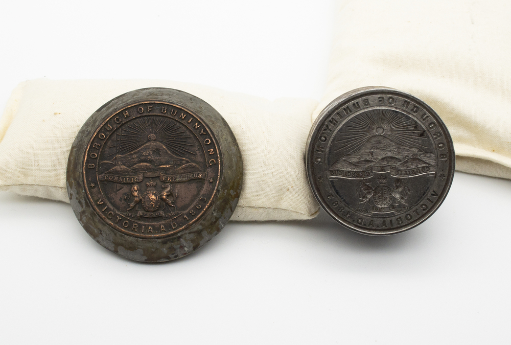 Metal seal with picture of the foothills and summit of Mount Buninyong with sun rising over the summit, plus the British coat of arms.