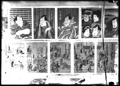 Plate MCK025 shows a number of Japanese woodblock prints. Three are of traditional “samurai” or Kabuki-style Japanese men in traditional dress and hairstyle; one is a composite of four different prints: two men and two women (samurai/geisha) in traditional dress. There are also several prints appearing to depict traditional scenes of indoor and outdoor life in Japan in the Edo period.